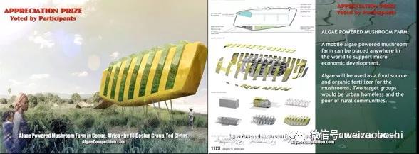 參與表彰獎頒將獎金為1000美元頒給了10個人設(shè)計小組的Ted Givins設(shè)計的非洲剛果的海藻蘑菇農(nóng)場。在世界任何地方都可以建立一個海藻能源驅(qū)動力的移動蘑菇農(nóng)場,以支持貧困地區(qū)的微觀經(jīng)濟發(fā)展。藻類將成為蘑菇的食物來源和肥料。設(shè)計方案針對兩個目標群體分別是城市無家可歸者和農(nóng)村貧困人口。剛果-金沙薩在非洲被選為第一個農(nóng)場。這些農(nóng)場重量輕,便于運輸和手工搬運到工地上進行安裝。四個農(nóng)場可以裝在一個40英尺的集裝箱里運送。